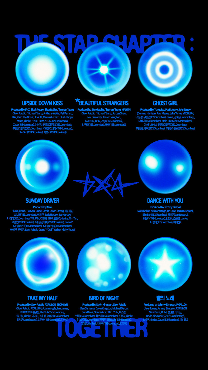 Además de “Beautiful Strangers”, The Star Chapter: TOGETHER presenta una diversa colección de canciones que reflejan el crecimiento artístico y la versatilidad de la banda. Los miembros contribuyeron activamente a la creación del álbum, aportando profundidad y autenticidad a cada canción. YEONJUN participó en la letra de “Upside Down Kiss” y “Ghost Girl”, BEOMGYU demostró su destreza como productor con “Take My Half”, y TAEHYUN contribuyó a la letra y composición de “Bird of Night”, canalizando con maestría las delicadas emociones en la música.