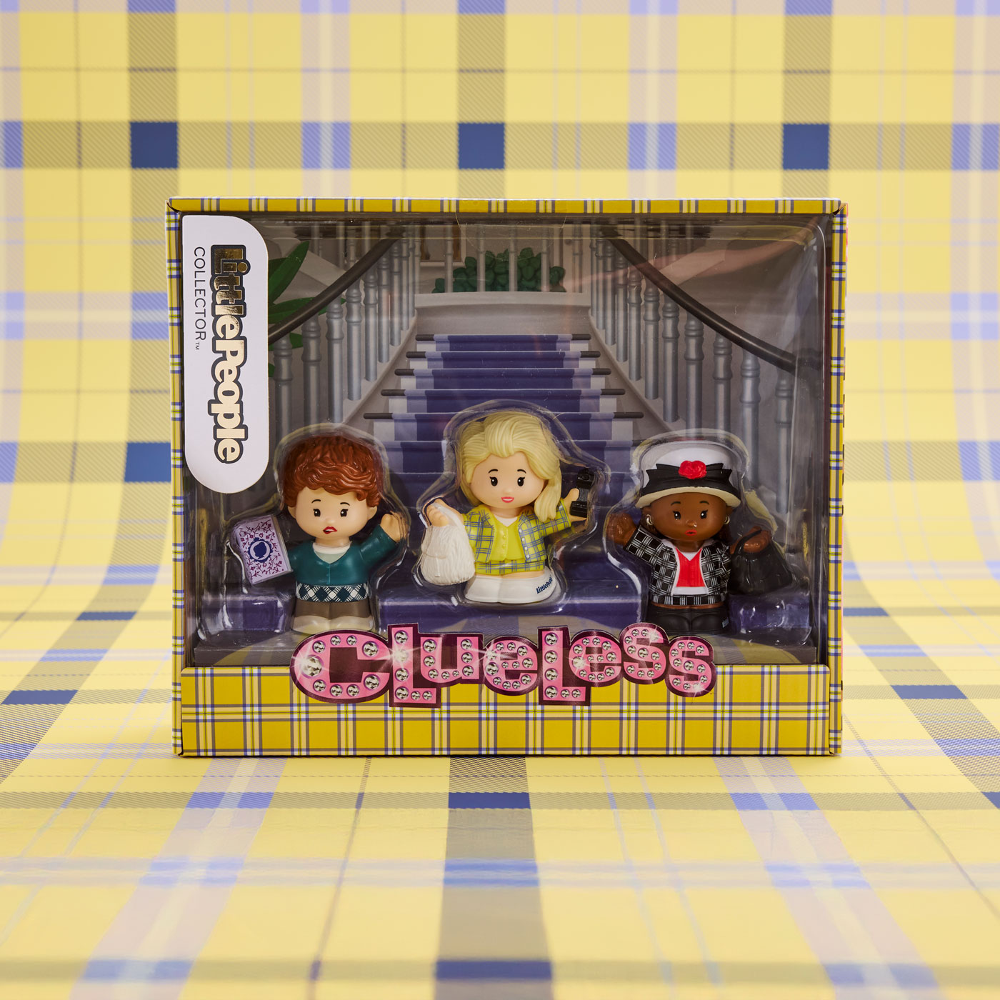 Cher, Dionne y Tai convertidos como figuras Little People en una edición de coleccionista. El set viene en una caja inspirada en la escalera de la casa de Cher, ideal para los fans que crecieron con la película y ahora quieren compartirla con las nuevas generaciones.