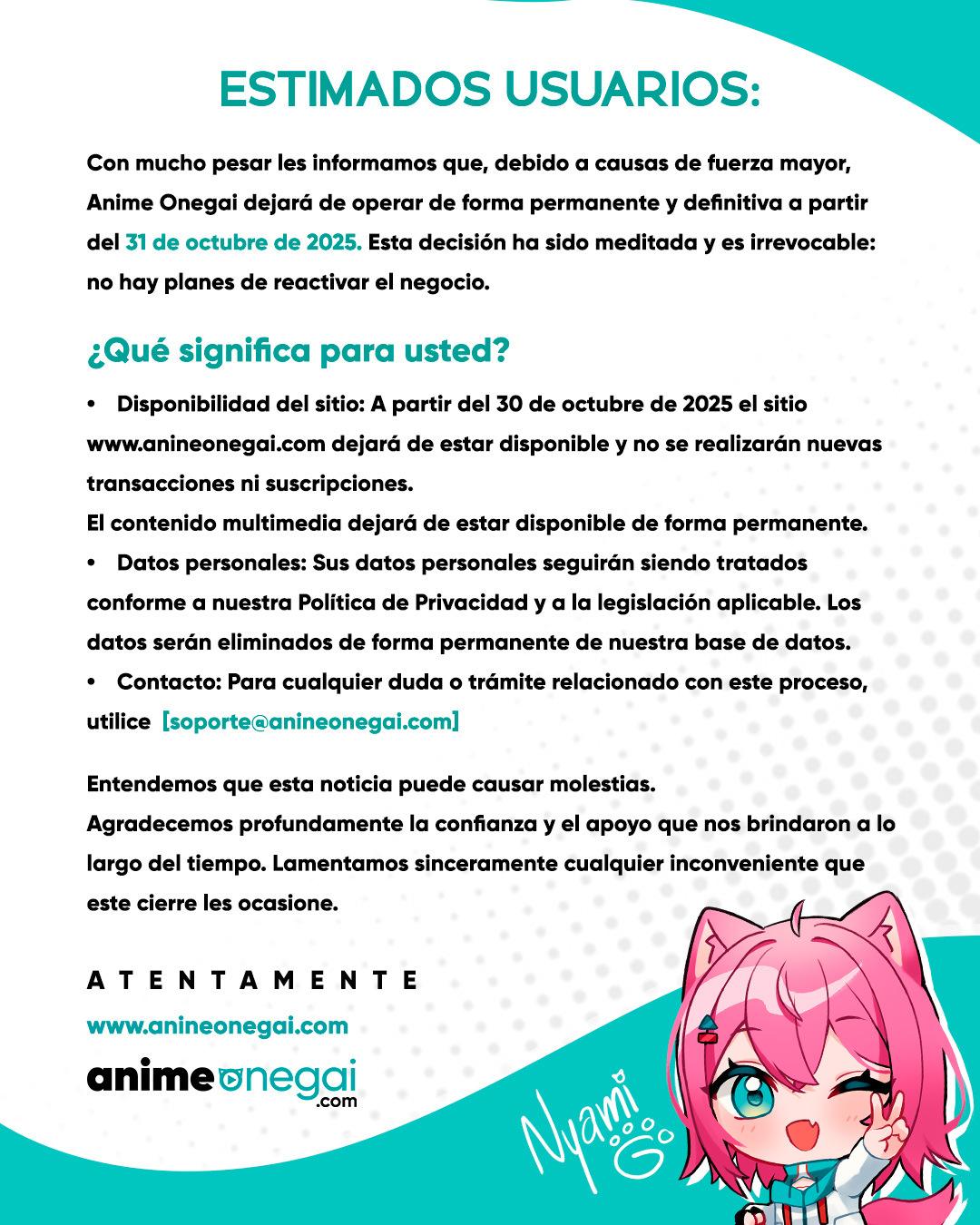 - El sitio web dejará de estar disponible el 30 de octubre de 2025. Desde esa fecha ya no se podrá acceder a la plataforma animeonegai.com, ni realizar suscripciones, compras o visualización de contenido.