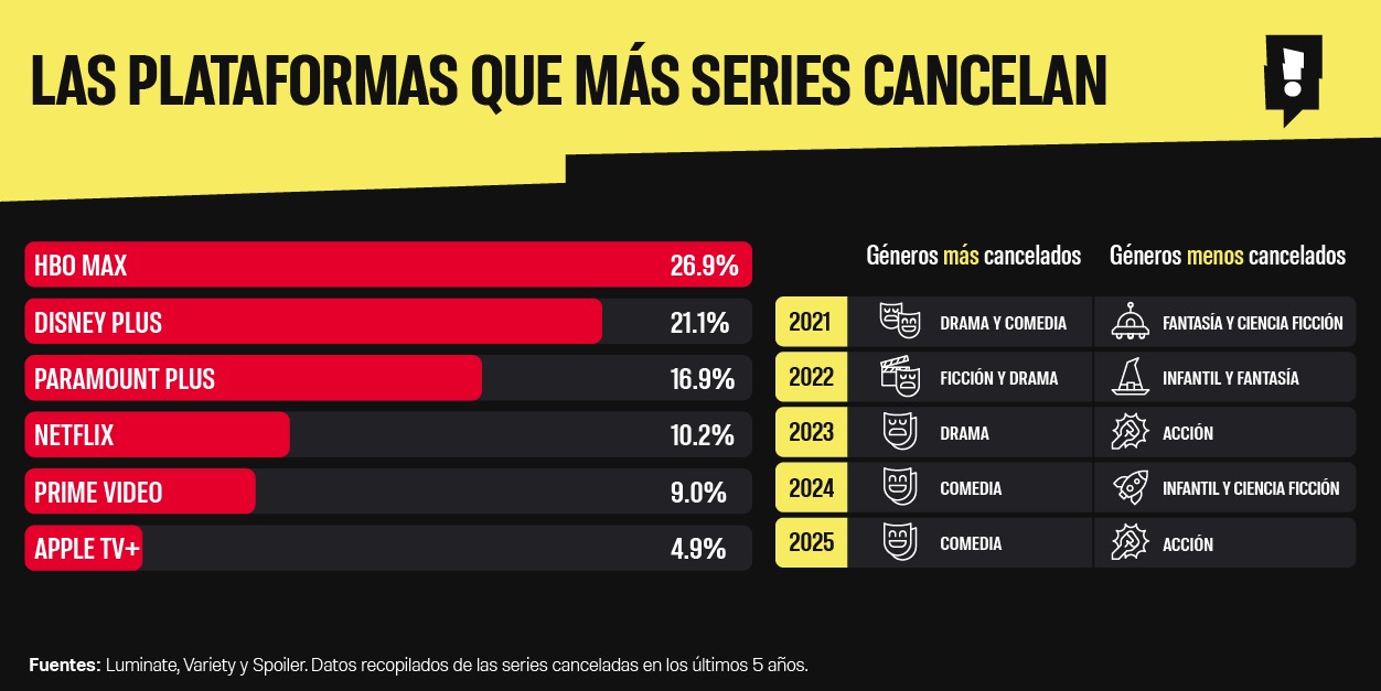 Un estudio de Spoiler analizó el periodo de 2021 hasta 2025 en las plataformas de streaming más populares para determinar los géneros con más cancelaciones. El análisis reveló una tendencia variable: Drama y Comedia lideraron en 2021, seguidos por Ficción y Drama en 2022. Drama fue el género más afectado en 2023, mientras que la Comedia ha encabezado las cancelaciones en 2024 y lo que va de 2025.