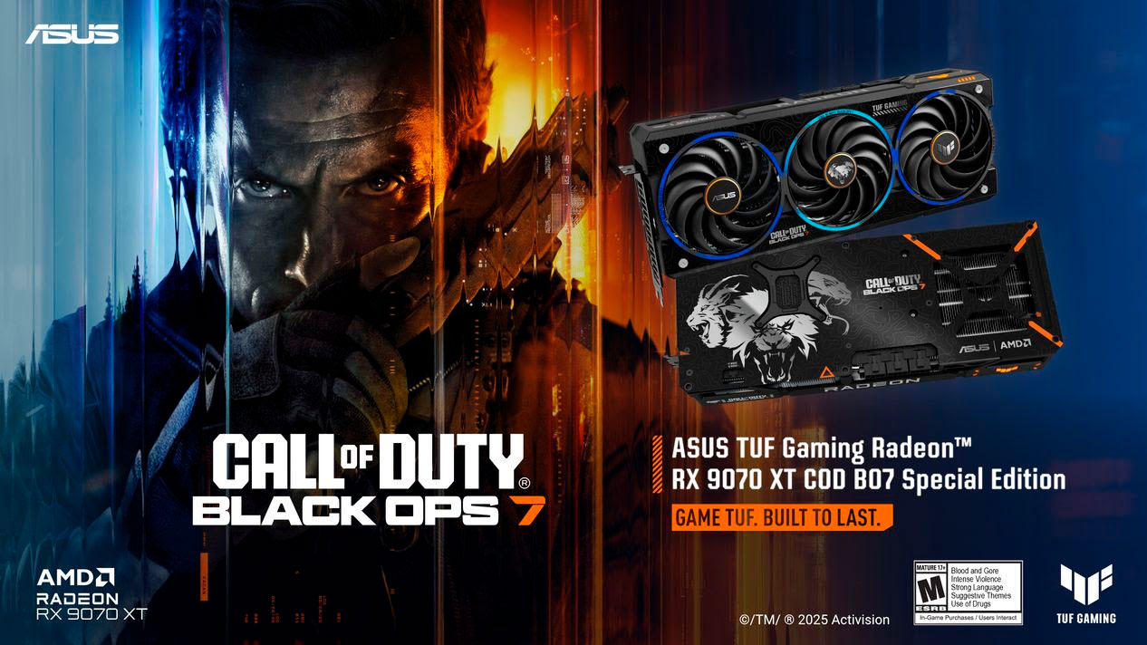 Por lo que ASUS anunció la edición especial Call of Duty®: Black Ops 7¹ de la tarjeta gráfica TUF Gaming Radeon™ RX 9070 XT, creada en colaboración con AMD y Call of Duty. Esta tarjeta gráfica única presenta el emblema de Call of Duty: Black Ops 7 con acentos en color naranja, en el icónico estilo Black Ops. Presentada por primera vez en el evento de prensa Call of Duty NEXT en Las Vegas el 30 de septiembre, esta tarjeta de edición limitada se venderá en minoristas seleccionados alrededor del mundo e incluirá una copia digital de la versión estándar del juego para PC.