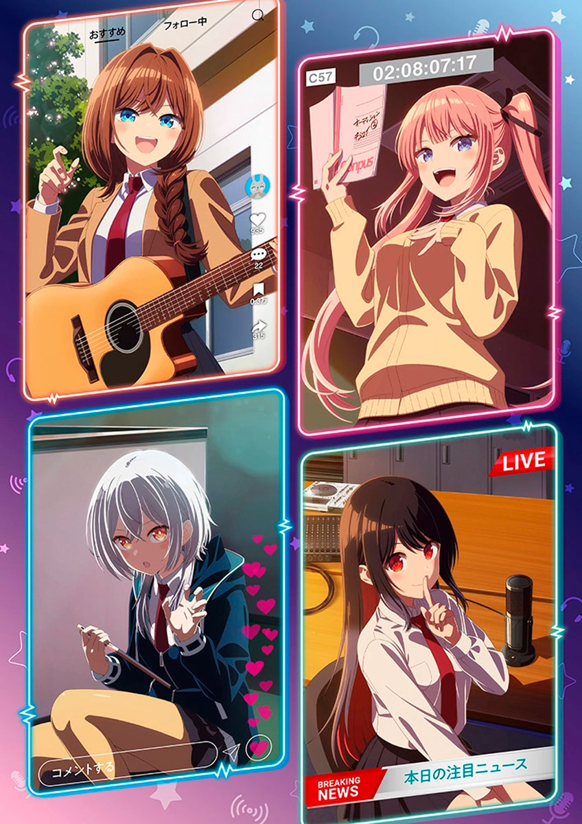 La imagen principal muestra a los protagonistas Rikka, Nene, Iko y Shinobu en sus especialidades, reflejando el espíritu del anime: pasión, amistad y el poder de la voz.