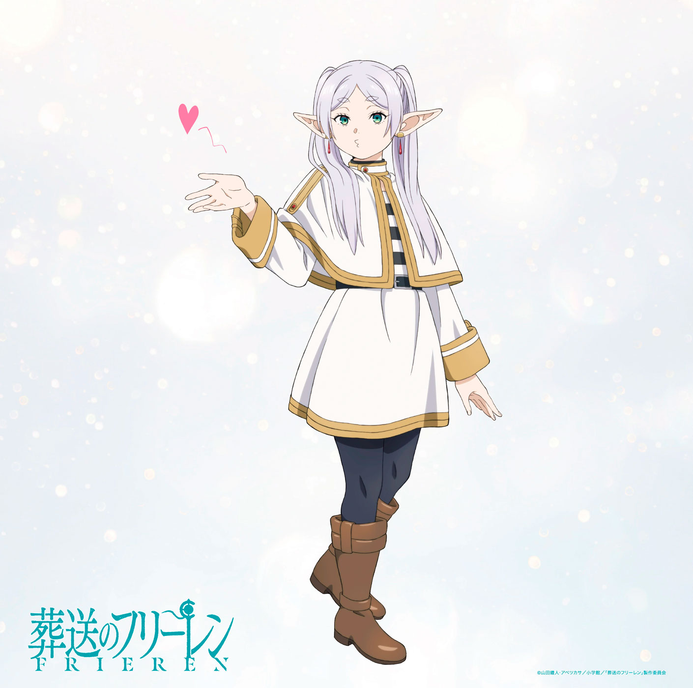 - Frieren lanzando un beso vestida con su atuendo de viaje clásico: túnica blanca, capa corta con ribetes dorados, pantalones gris oscuro y botas de cuero marrón.