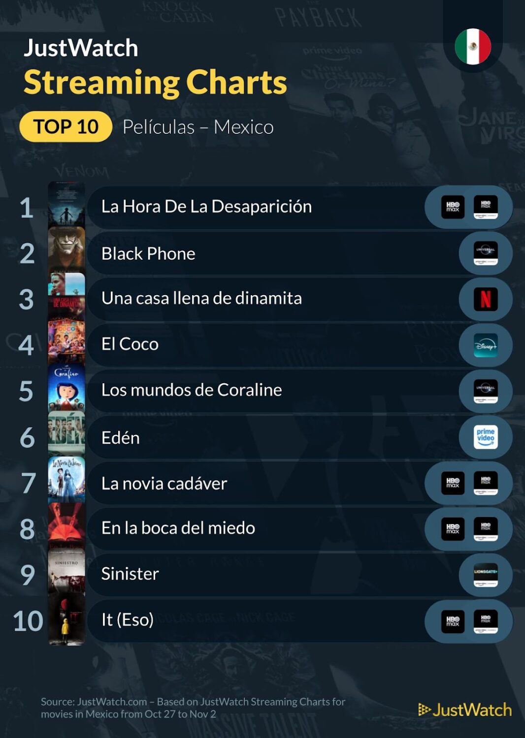 JustWatch también compartió el ranking de películas más vistas, donde el suspenso y el horror dominaron las pantallas mexicanas. La hora de la desaparición encabeza la lista, seguida por Black Phone y el fenómeno de culto Los mundos de Coraline.