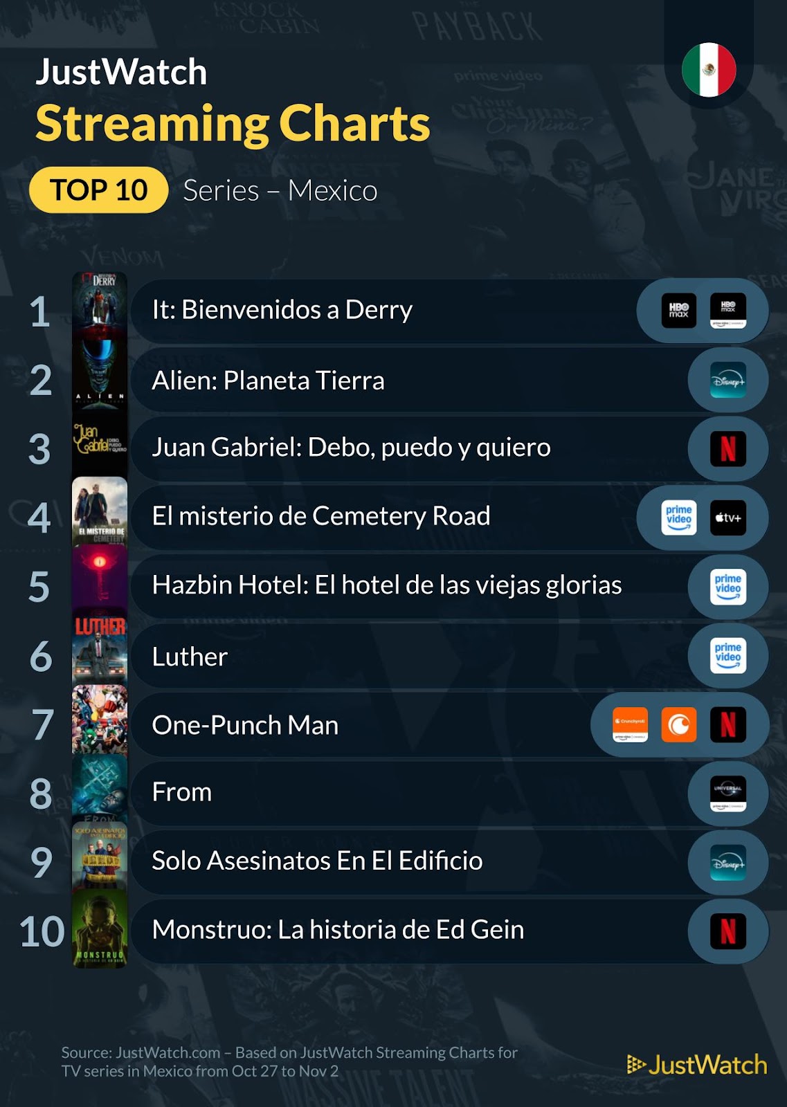 Mientras títulos como It: Bienvenidos a Derry (HBO Max), Alien: Planeta Tierra (Disney+) y El misterio de Cemetery Road (Prime Video + Apple TV+) dominan los primeros puestos, es llamativo que One Punch Man, una producción animada japonesa con sello de culto, mantenga su lugar entre las 10 series más consumidas.