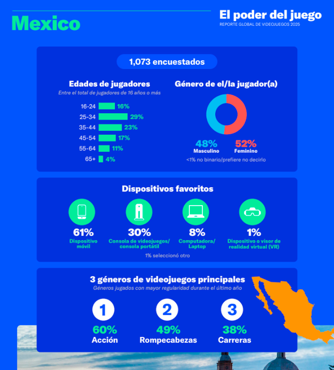 Ciudad de México, 26 de noviembre de 2025 – La Entertainment Software Association (ESA), en colaboración con asociaciones de videojuegos de todo el mundo, publicaron el informe Global Power of Play 2025. El informe revela los beneficios sociales y emocionales de los videojuegos, confirmados tanto por investigaciones académicas como por una encuesta realizada a 24,216 jugadores activos (semanalmente), mayores de 16 años, en 21 países: Australia, Brasil, Canadá, China, Egipto, Francia, Alemania, India, Italia, Japón, México, Nigeria, Polonia, Arabia Saudita, Sudáfrica, Corea del Sur, España, Suecia, Emiratos Árabes Unidos, el Reino Unido y los Estados Unidos de América.