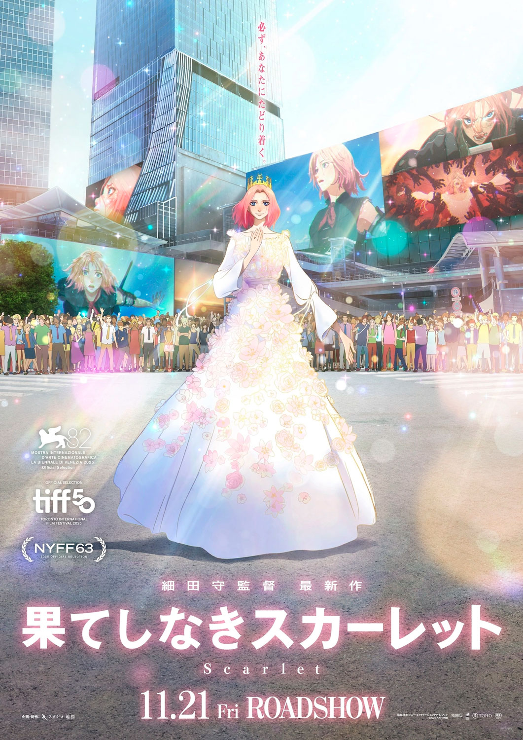 El visual muestra a la princesa Scarlet, protagonista de la cinta, de pie en medio de las calles de Shibuya, rodeada por pantallas gigantes que proyectan escenas clave de la historia, mientras una multitud se congrega a su alrededor. La imagen combina elementos del presente urbano con la mitología oscura del mundo al que será arrastrada la heroína, ofreciendo un contraste que recuerda al enfoque visual de Belle, otra obra destacada de Hosoda.