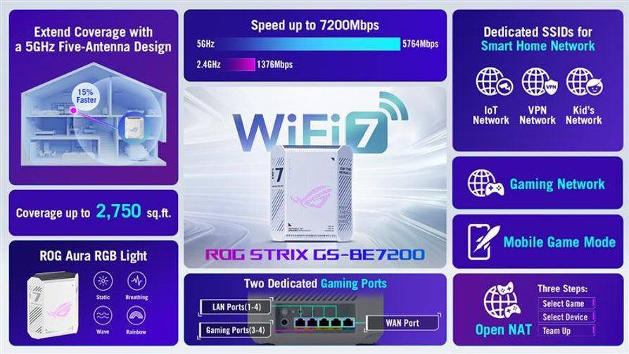 ASUS Republic of Gamers (ROG) anunció el ROG Strix GS-BE7200, un router gaming WiFi 7 (802.11be) de doble banda de nueva generación, diseñado para jugadores que exigen conectividad rápida, estable e inteligentemente optimizada. Al aprovechar Multi-Link Operation (MLO), canales ultranchos de 160MHz y modulación 4K-QAM, el GS-BE7200 maximiza la eficiencia y la capacidad inalámbrica total, ofreciendo un rendimiento inalámbrico de hasta 7200Mbps para permitir juego en línea ultra fluido, streaming de baja latencia y transferencias de datos a alta velocidad ― incluso en entornos congestionados.