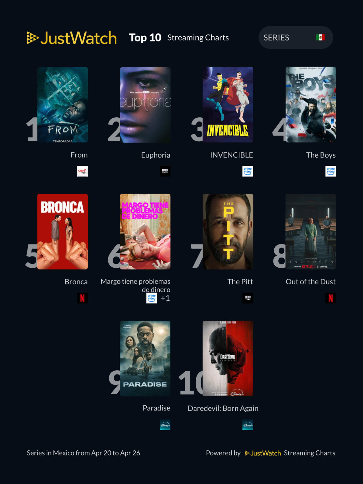 El panorama del streaming en México sigue moviéndose cada semana, y ahora JustWatch.com compartió su más reciente ranking con las 10 películas y series más vistas del 20 al 26 de abril de 2026. La lista deja varias sorpresas, regresos potentes y títulos que están generando conversación entre fans de la cultura pop.